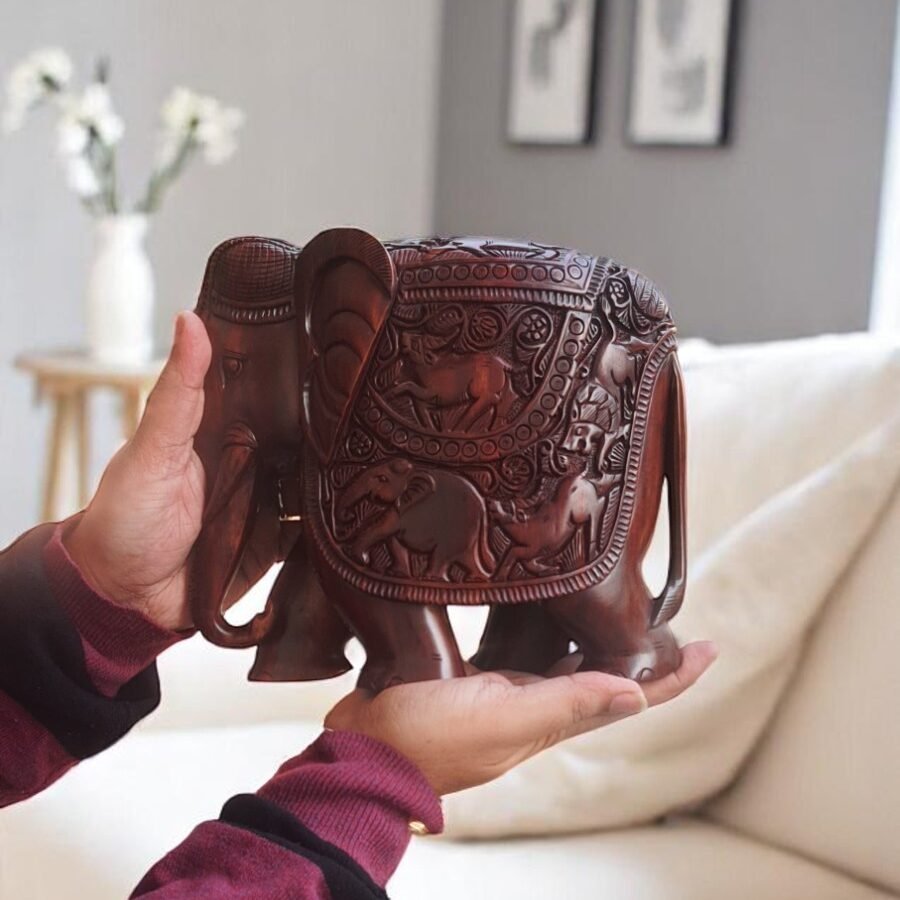 Handcrafted rosewood elephant sculpture with intricate carvings—symbol of strength, luck, and tradition; used for décor or spiritual charm.